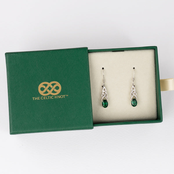 Expertly crafted from sterling silver and finished in luminous 18K white gold, this matching pair strikes the perfect balance of timeless elegance and mystical charm. Each earring features a natural emerald-green zircon that sparkles like a tiny emerald moon, believed to enhance intuition and heartfelt compassion. The gentle Celtic knot detailing above each stone represents an eternal bond – a nod to the unbroken connections between past, present, and future generations.