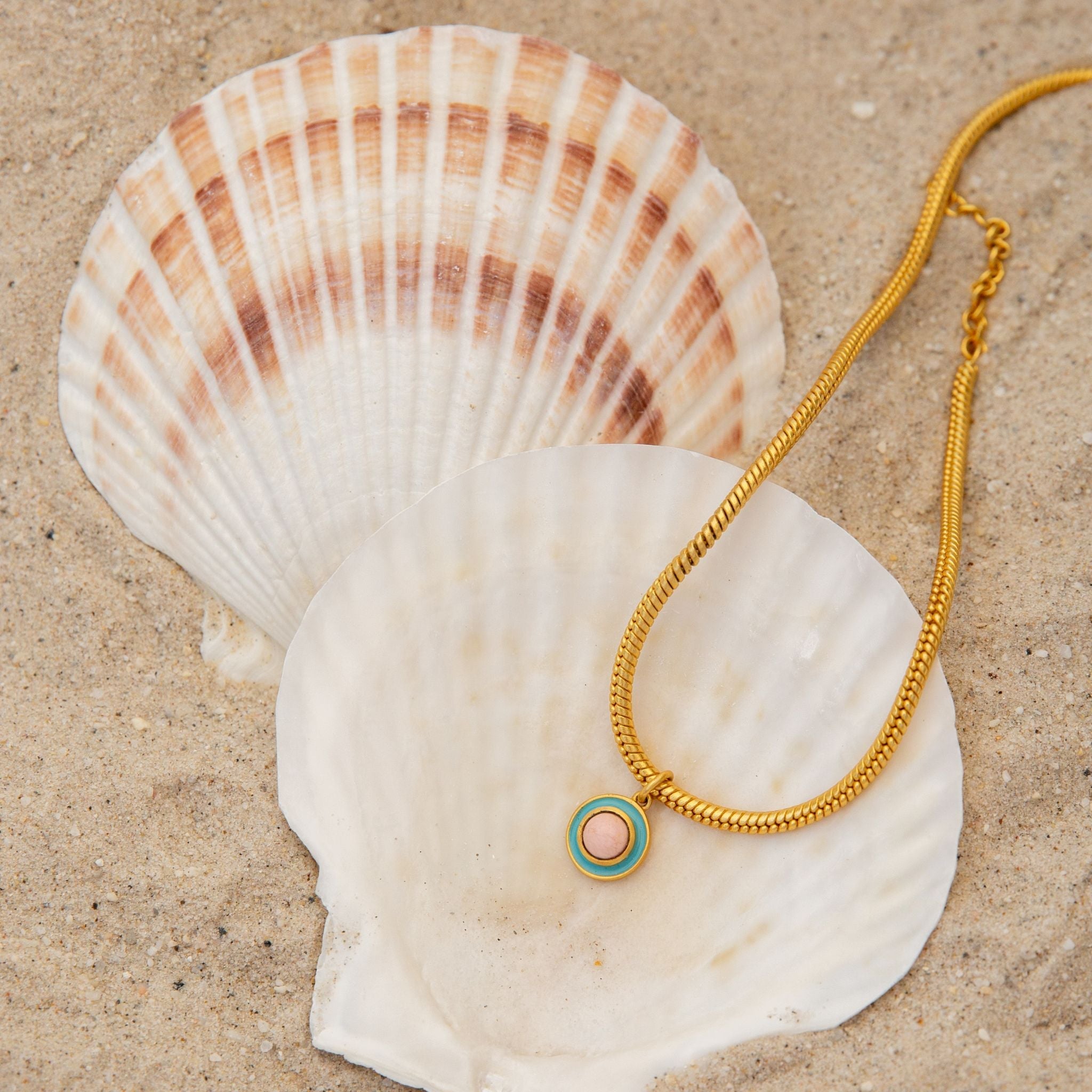 The Blue Grotto Pendant Necklace will make waves whenever it's added to your look. This pendant necklace features a pink opal stone set into 18K gold-plated brass and surrounded by turquoise enamel. Attached to a rope chain, this necklace is nickel-free and hypoallergenic. Paired with the matching Blue Grotto Stud Earrings, this pendant necklace is a beautiful look.