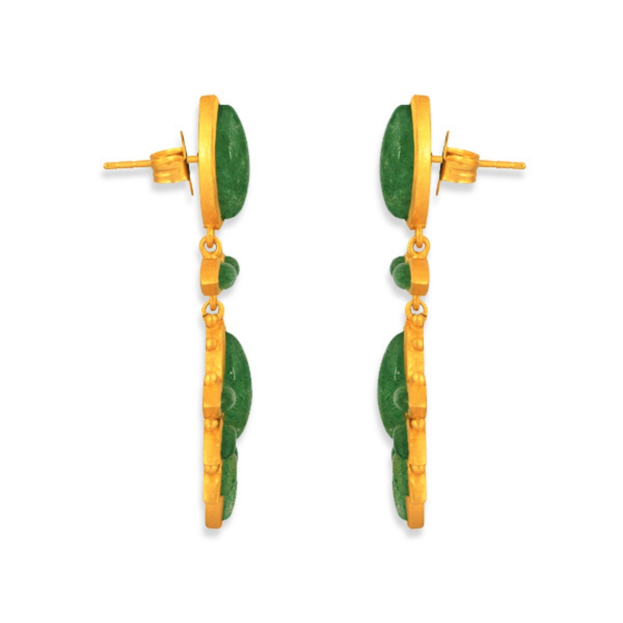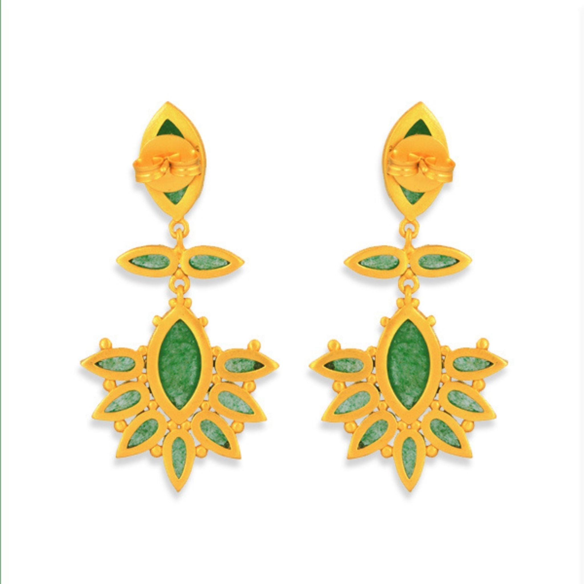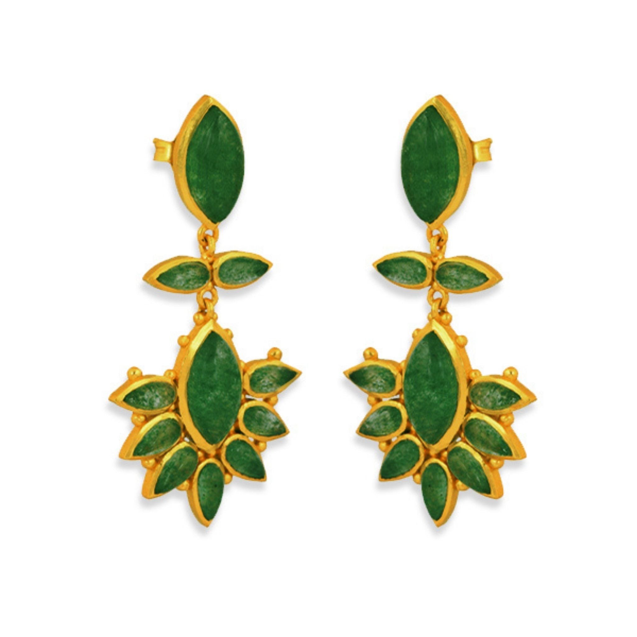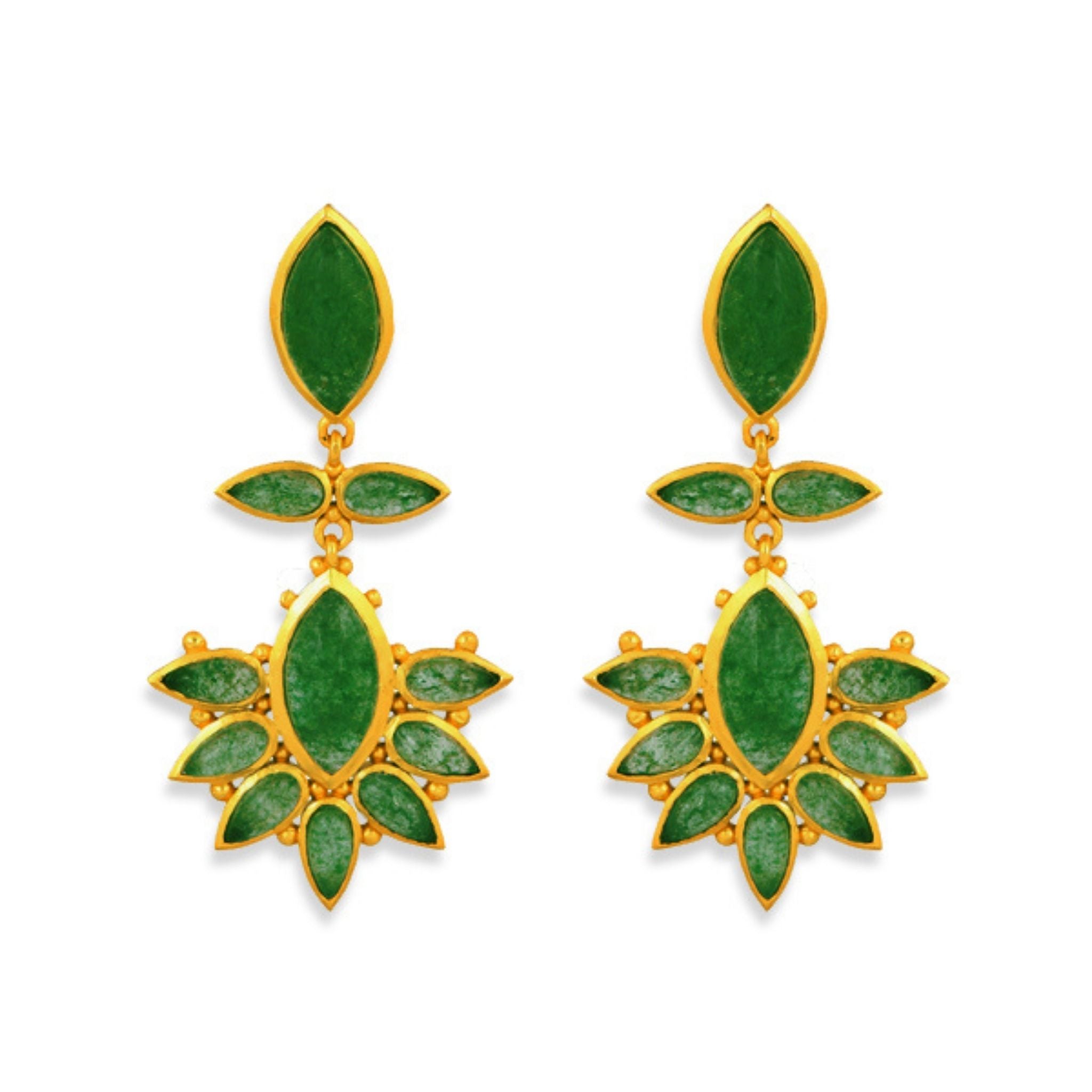 Statement-making doesn’t begin to describe the gorgeous Dreamcatcher Drop Earrings. These unique drop earrings feature an oblong green strawberry quartz stone at the base with a secure post-back. Dangling from the base of this 18K gold-plated brass earring is a chain flanked by two small teardrop-shaped stones that bloom into a half starburst mosaic of green strawberry quartz and gold. Looking to amp up the look? Pair these hypoallergenic earrings with the Zion Cuff or Rio Collar Necklace to create a unique styling.