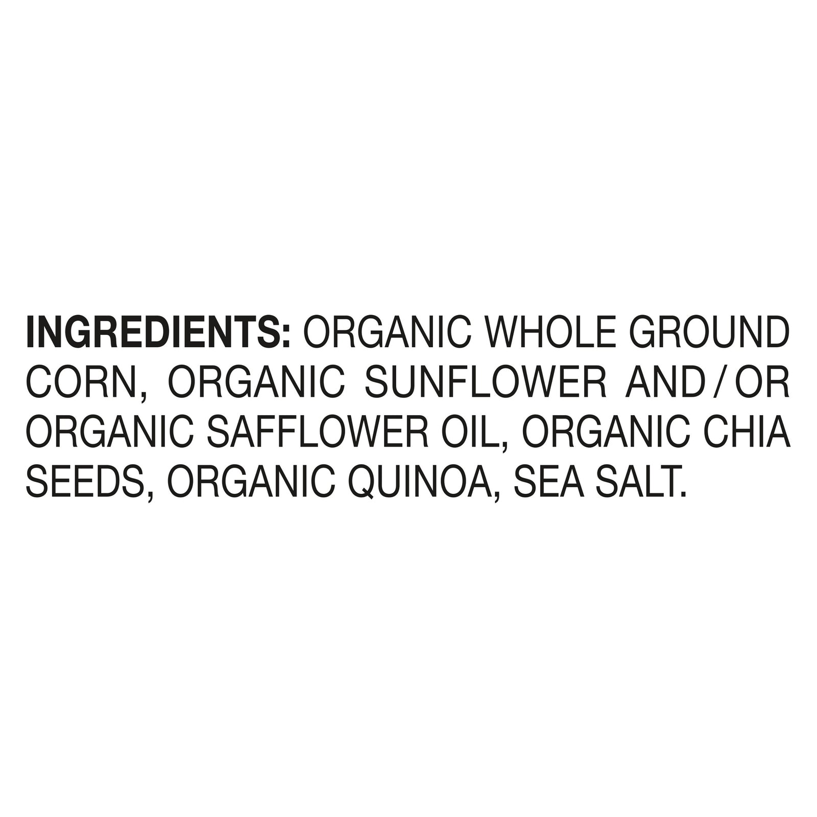 - Made with organic whole ground corn, chia seeds, and quinoa.