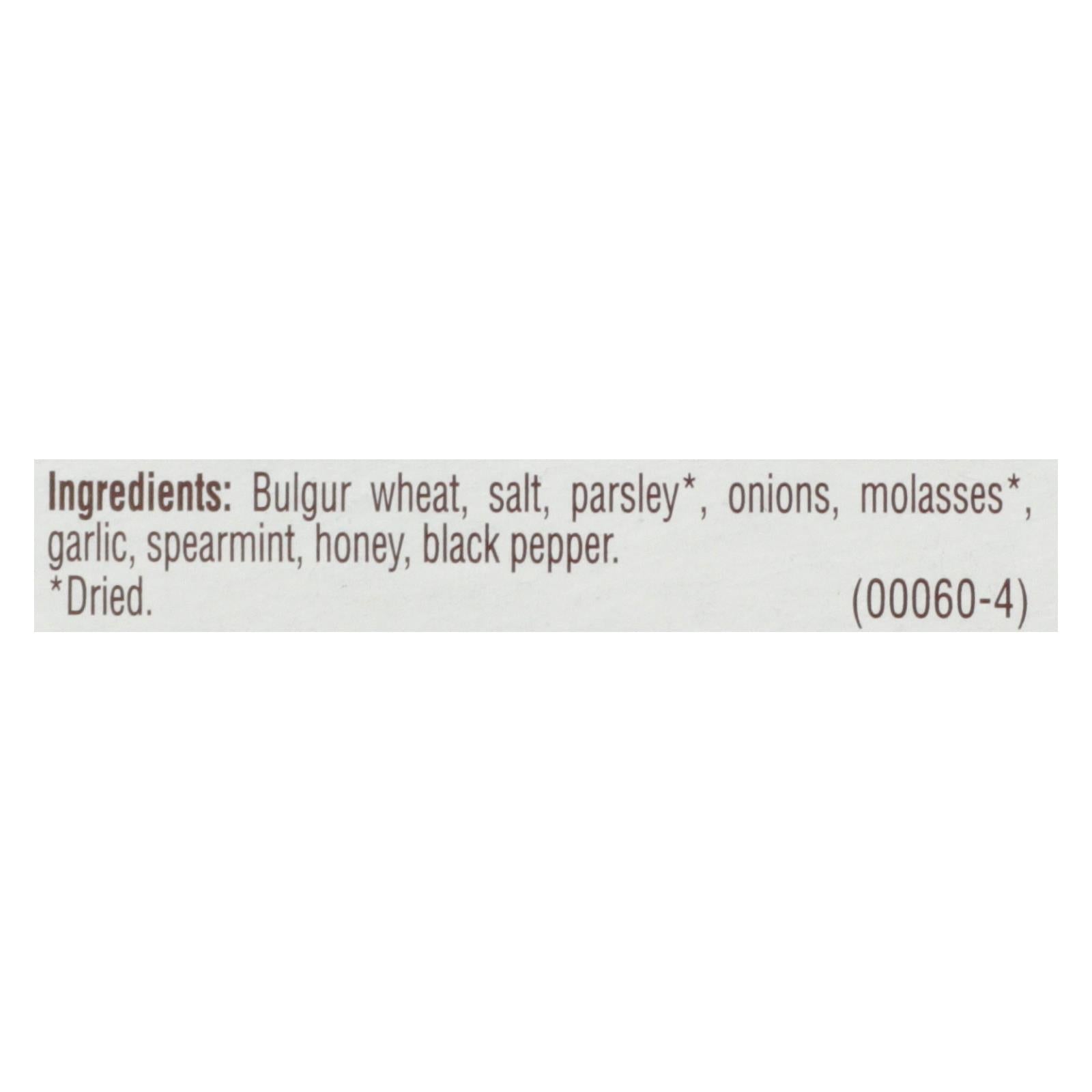 Delight in the authentic flavors of the Mediterranean with this exquisite Tabbouleh Mix. Each case contains 12 convenient 5.25 oz packages, perfect for stocking your pantry or sharing with friends and family. This kosher-certified mix is made in the United States using a wholesome blend of bulgur wheat, parsley, and a medley of aromatic spices.
